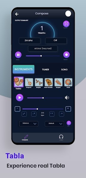 SurSadhak’s Tabla replaces a Tabla player and brings a real Tabla experience. Beginners, as well as maestros, can do their practice with this percussion instrument. Here Tabla has a list of 22 Taals (Teentaal, Ektaal, Jhaptaal etc). You can also adjust the scales (A#, D, G, etc) by using the Tuner section. It’s so easy to fine-tune the scale and adjust the pitch. The short information section displays which taal you’re chosen from the list and at which scale and speed. You can even change and adjust the tempo i.e from 25-300 bpm.